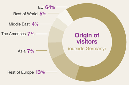 來自德國以外的參展商和觀眾的比例分別為48%34%,海外參展商的比例繼續(xù)有所增加,但海外觀眾的比例有輕微下跌。繼德國之后參展商最多的國家分別是:意大利、土耳其、中國、荷蘭、瑞士、西班牙、奧地利、法國和美國。繼德國之后觀眾最多的國家分別是:奧地利、荷蘭、瑞典、瑞士、英國、意大利、丹麥、比利時、印度、捷克共和國和波蘭。
