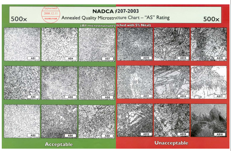 由該評(píng)級(jí)圖可知,位于藍(lán)色折線右側(cè)的不可接受退火組織具有三個(gè)主要特征:沿晶界析出網(wǎng)狀碳化物、由局部偏析造成的部分區(qū)域碳化物空白、析出碳化物分布排列呈不同位向的針狀、嚴(yán)重的偏析以及沿晶碳化物析出。
