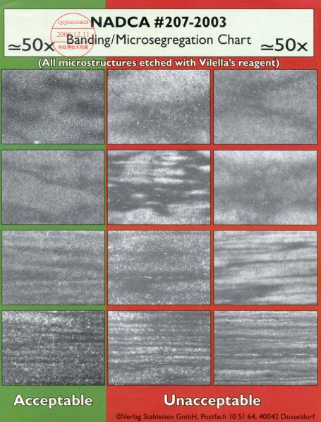 NADCA 207#-2003標(biāo)準(zhǔn)中進(jìn)行了修訂,劃分依據(jù)是偏析帶中是否存在可見(jiàn)的大顆粒一次碳化物,存在即判為不合格,并且不再區(qū)分不同鋼種的帶狀組織。如下圖: