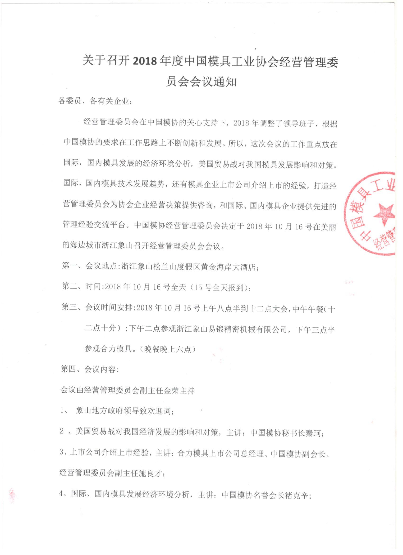 關于召開2018年度中國模具工業協會經營管理委員會會議通知