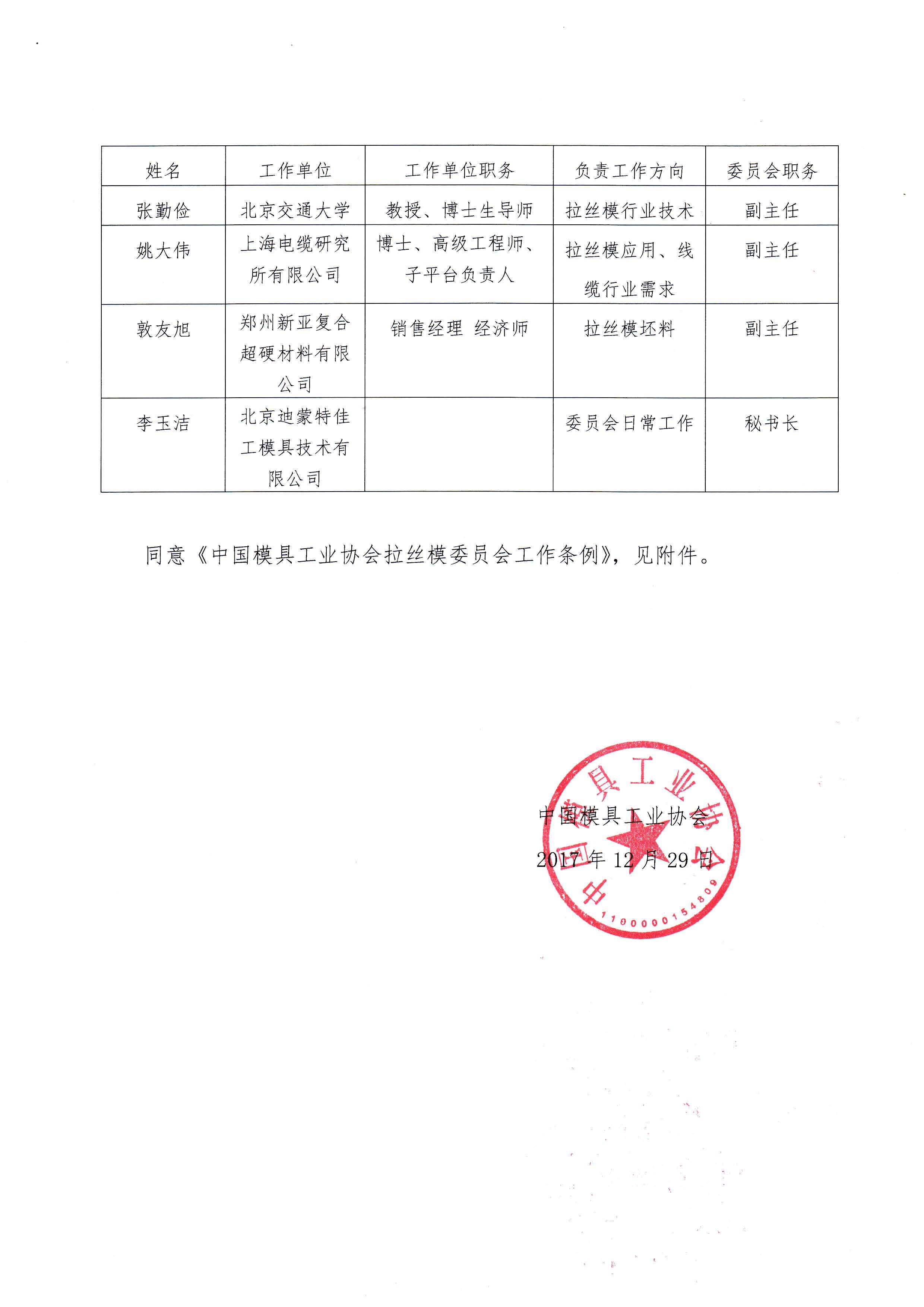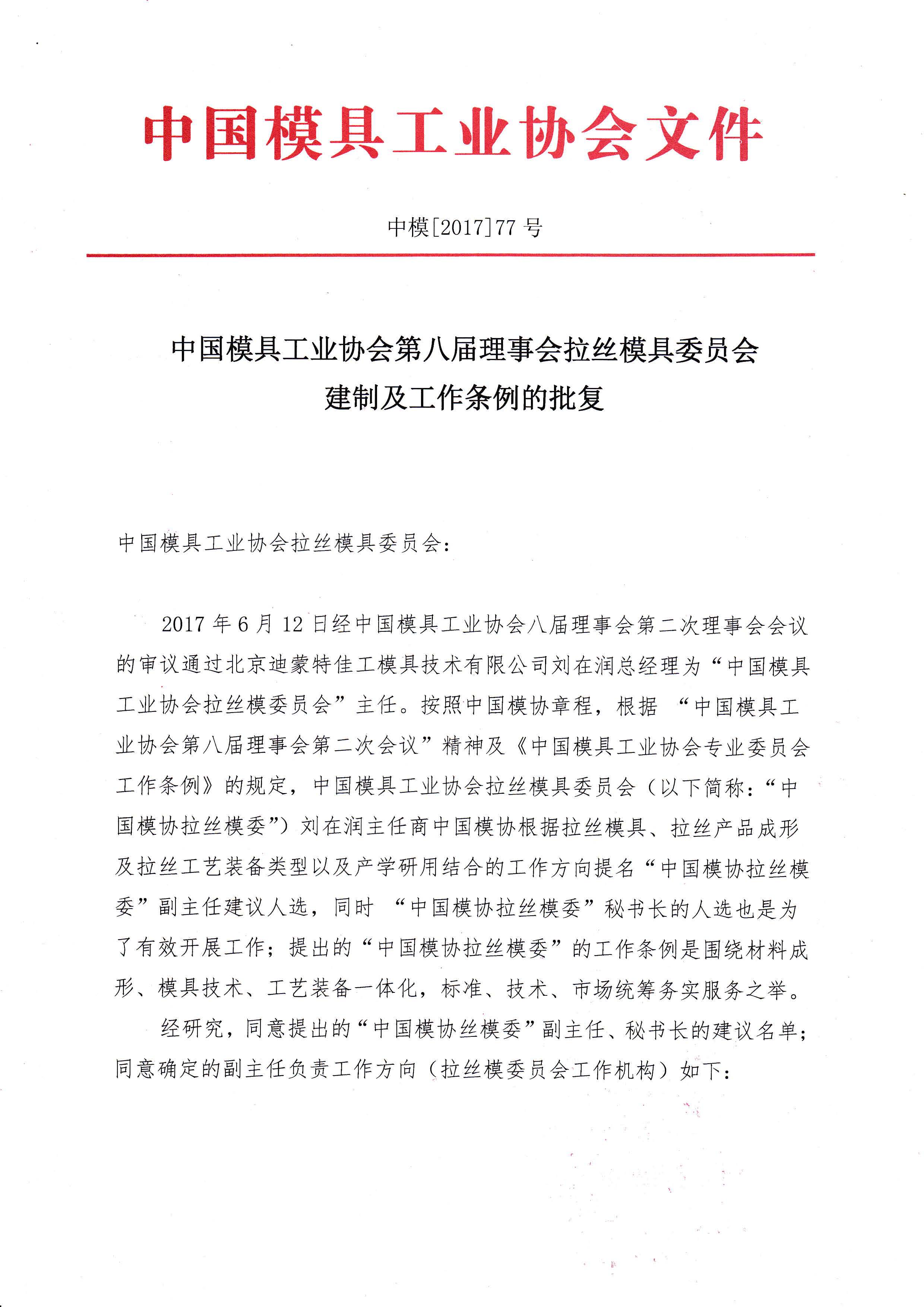 中國(guó)模具工業(yè)協(xié)會(huì)第八屆理事會(huì)拉絲模具委員會(huì)建制及工作條例的批復(fù)