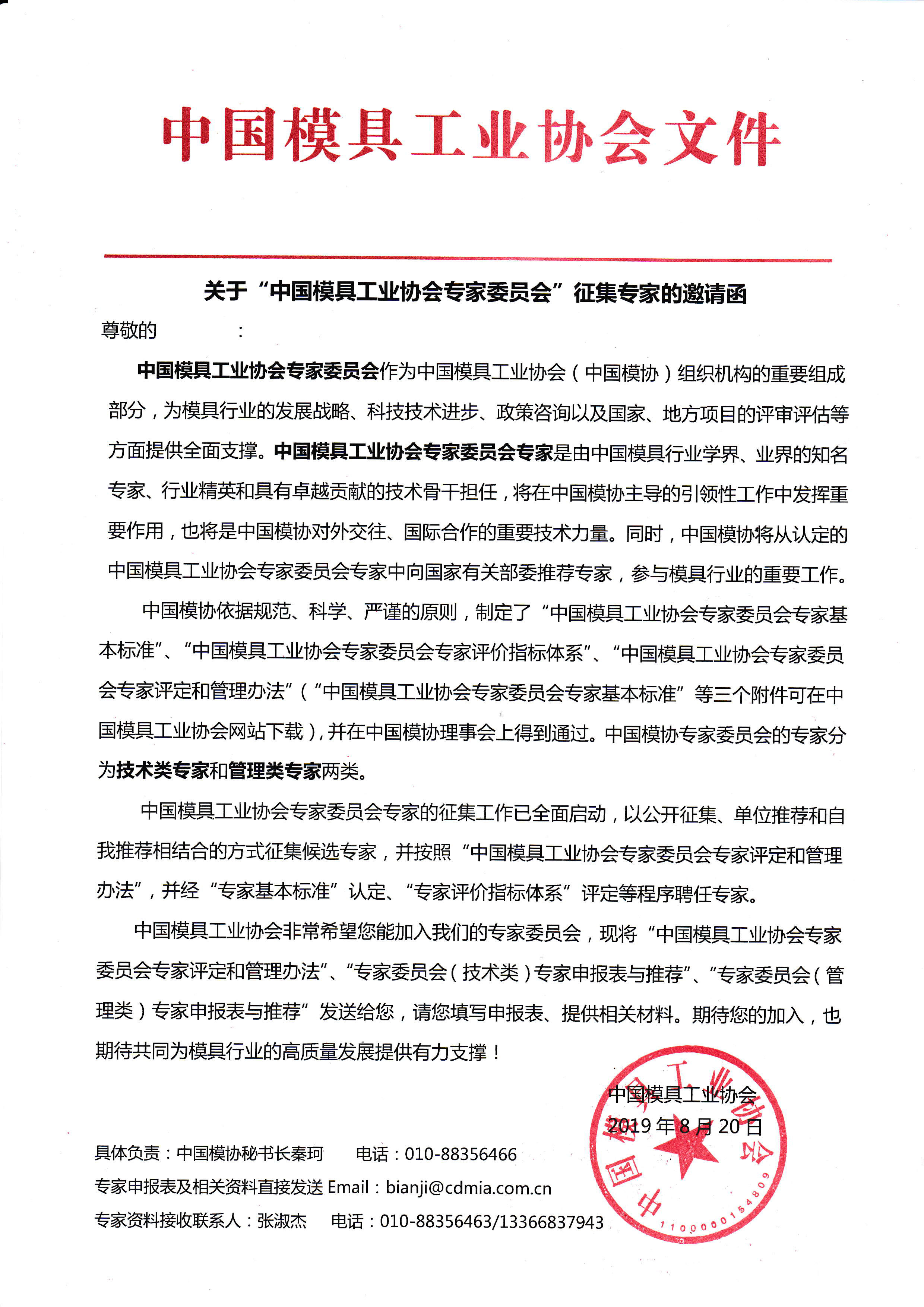 關于“中國模具工業協會專家委員會”征集專家的邀請函