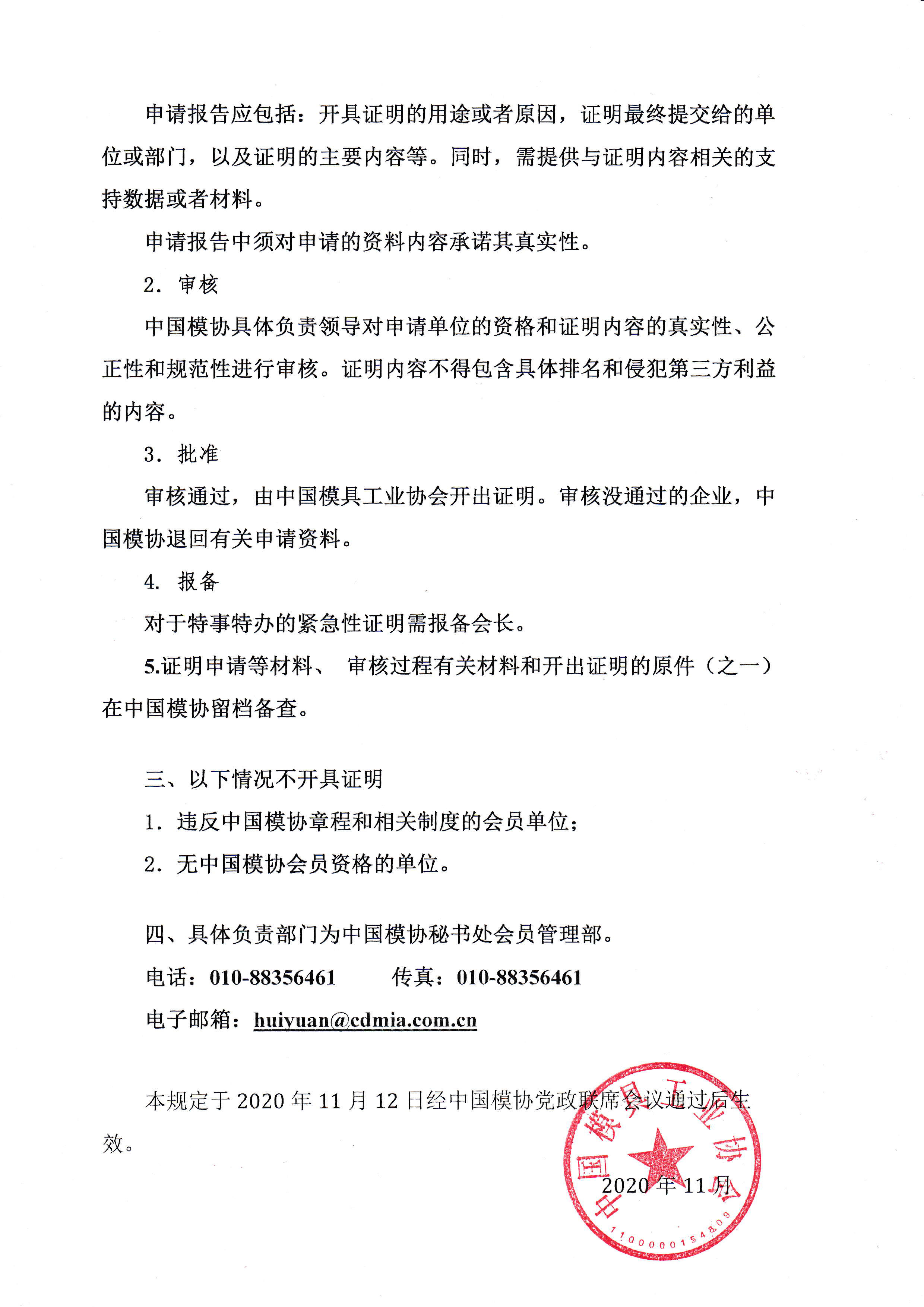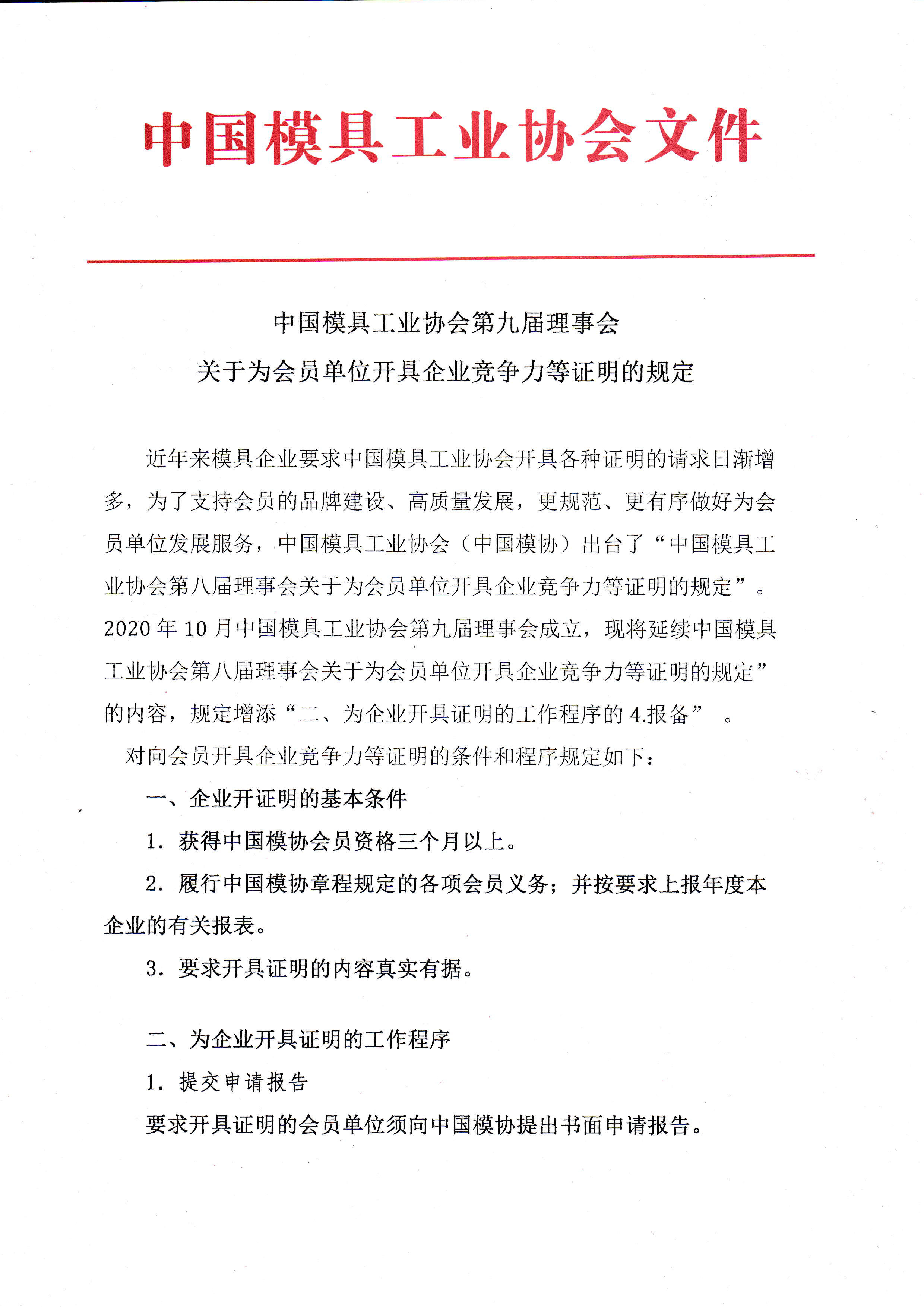 中國模具工業(yè)協(xié)會第九屆理事會關(guān)于為會員單位開具企業(yè)競爭力等證明的規(guī)定