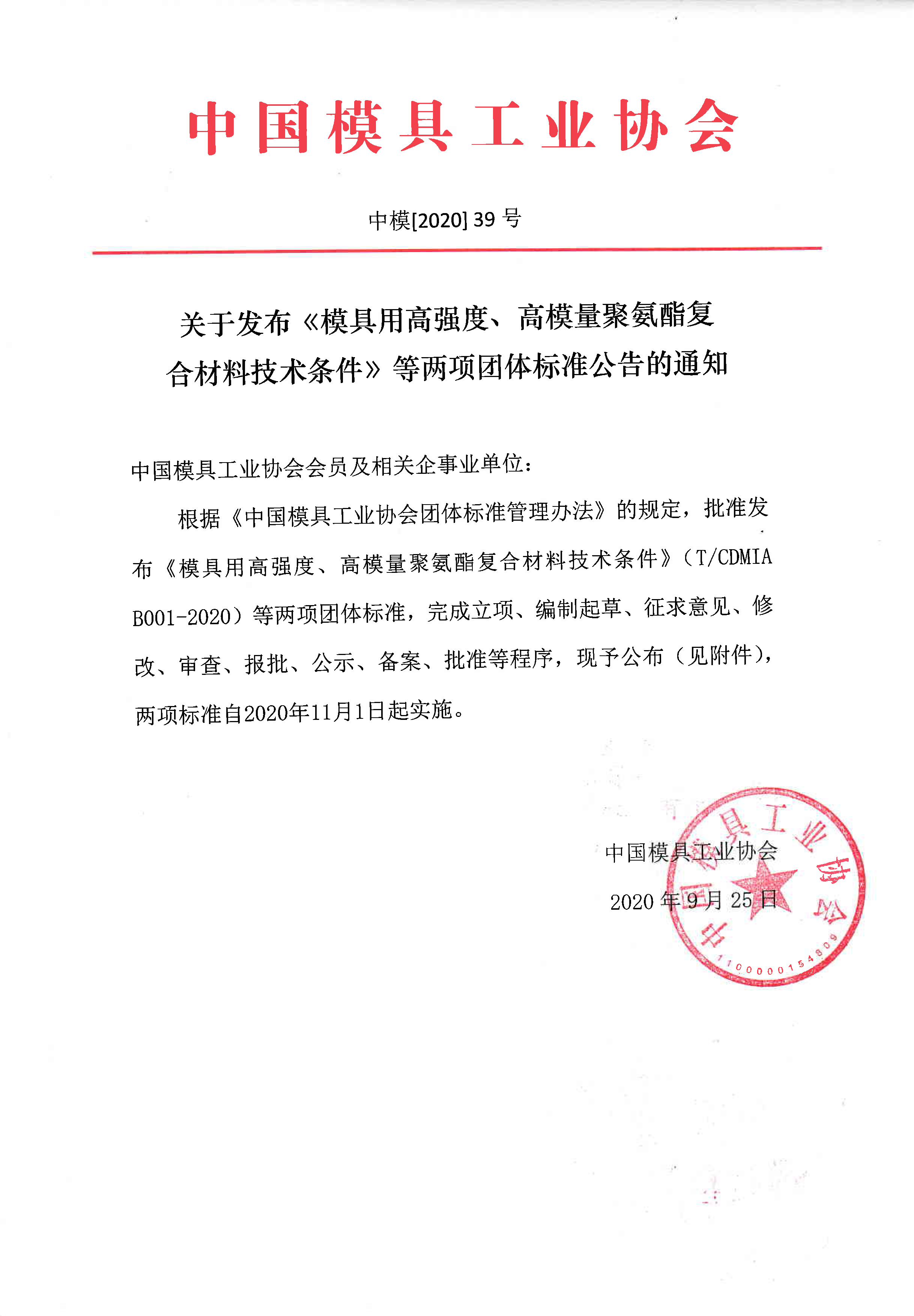 關(guān)于發(fā)布《模具用高強(qiáng)度、高模量聚氨酯復(fù)合材料技術(shù)條件》等兩項(xiàng)團(tuán)體標(biāo)準(zhǔn)公告的通知