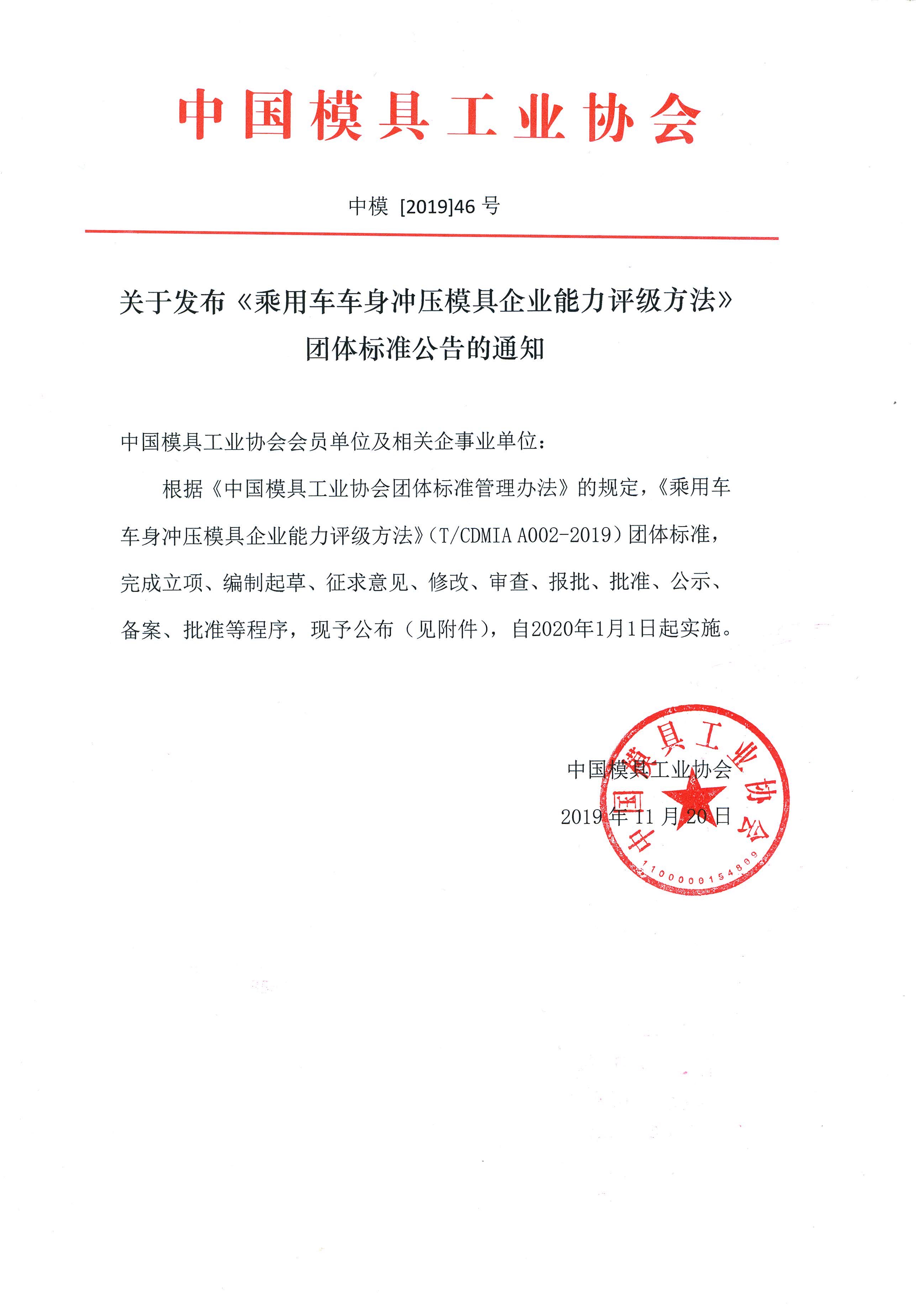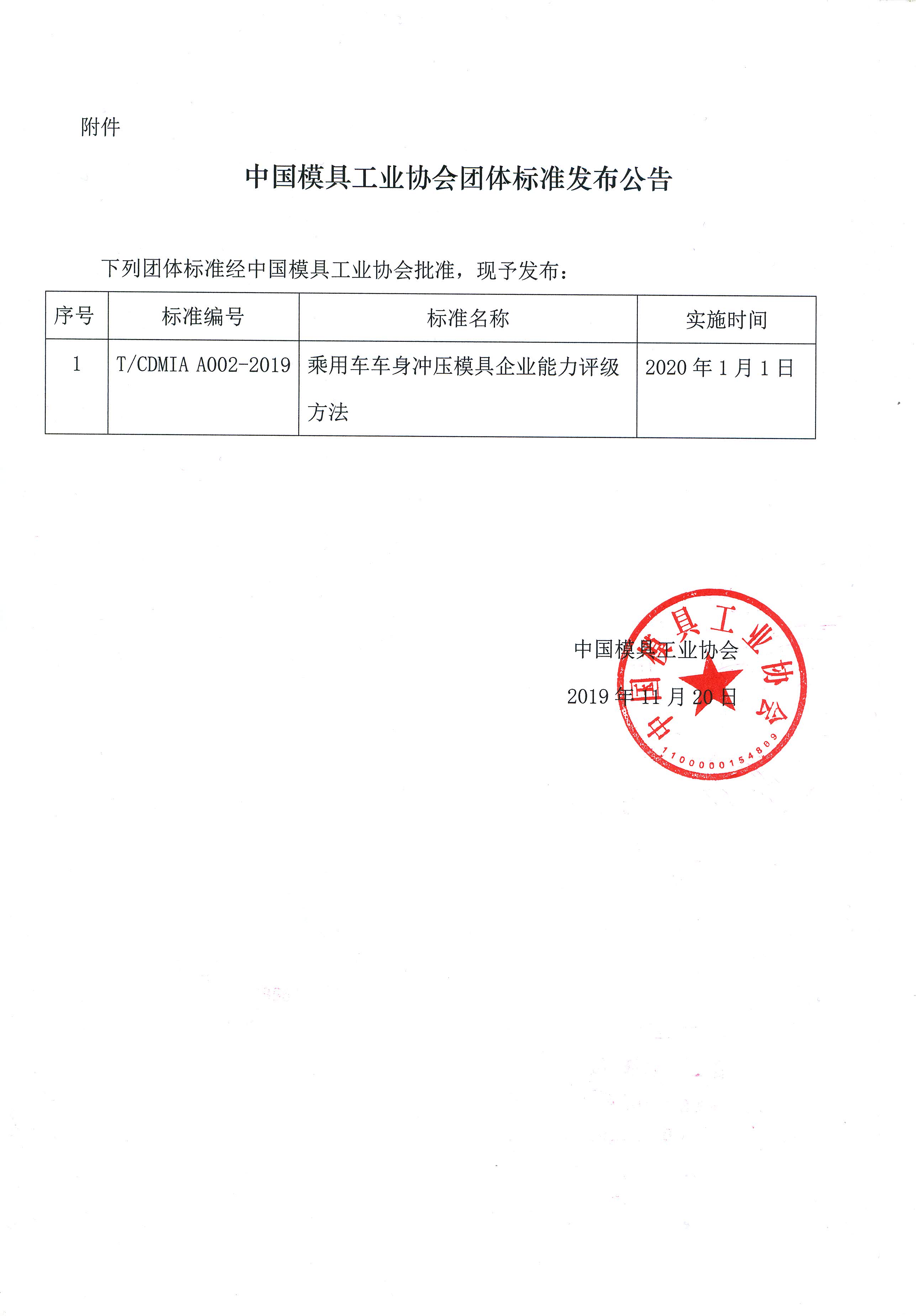 關(guān)于發(fā)布《乘用車車身沖壓模具企業(yè)能力評級方法》團體標準公告的通知
