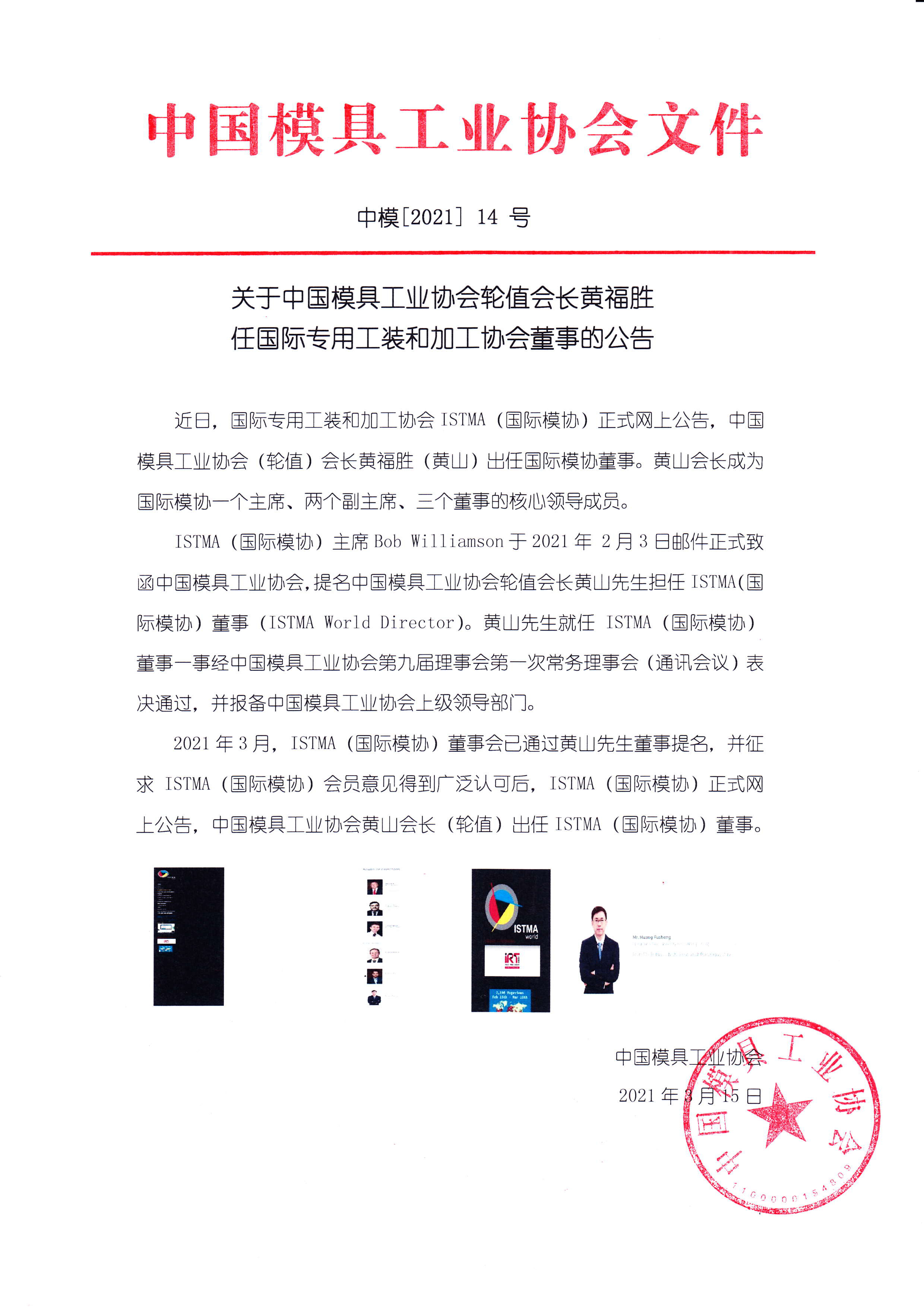 關于中國模具工業協會輪值會長黃福勝任國際專用工裝和加工協會董事的公告