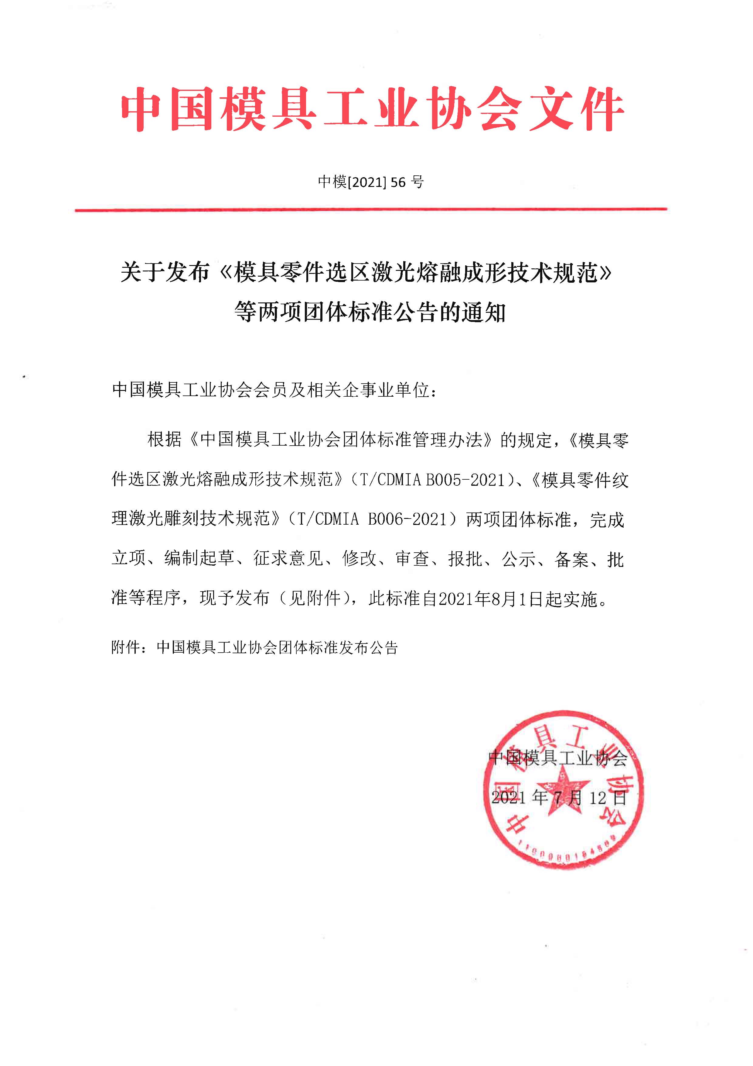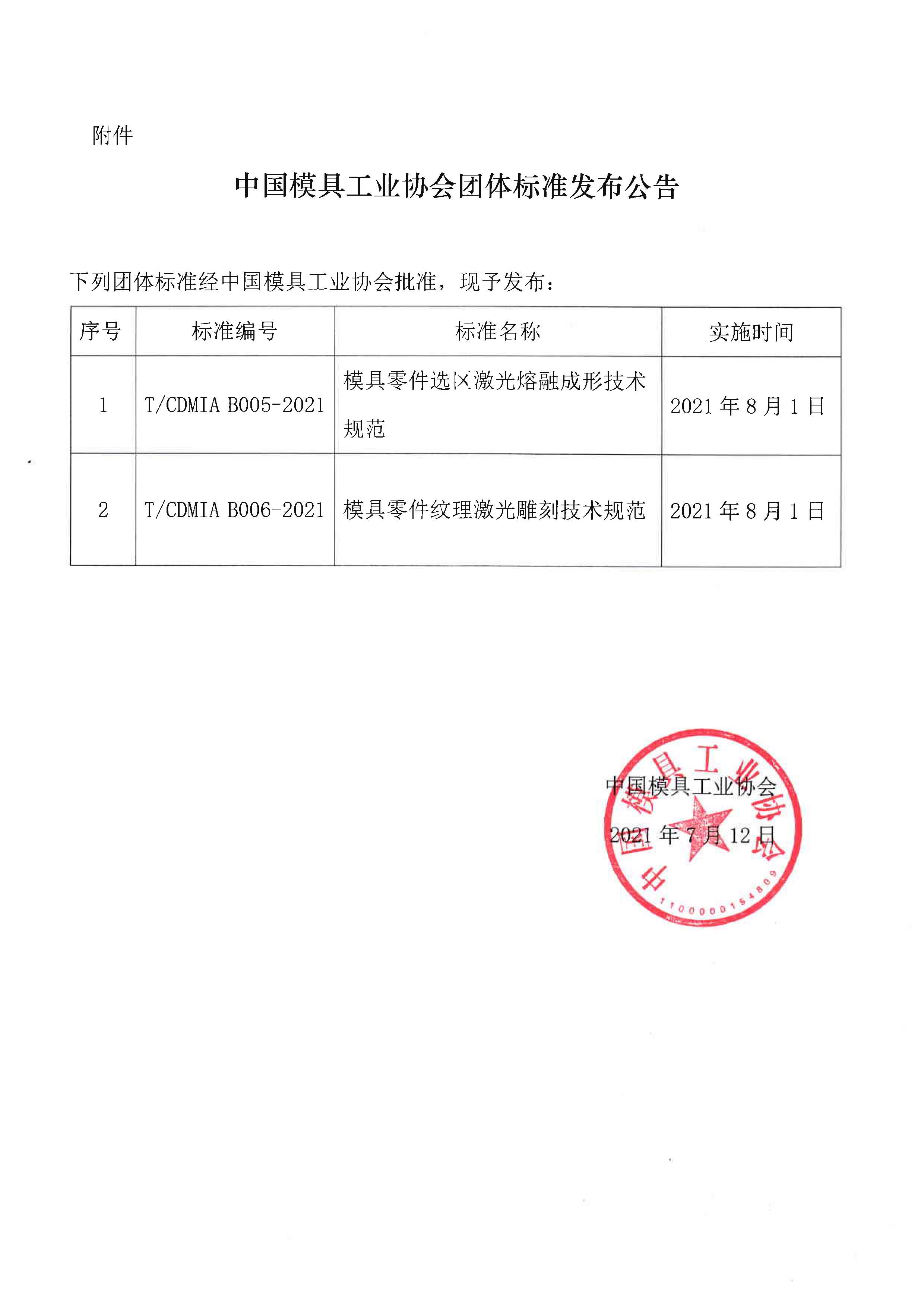 關(guān)于發(fā)布《模具零件選區(qū)激光熔融成形技術(shù)規(guī)范》等兩項(xiàng)團(tuán)體標(biāo)準(zhǔn)公告的通知