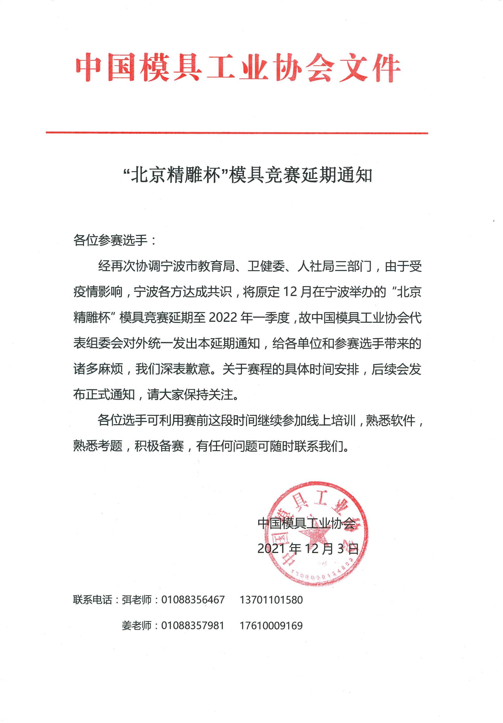 “北京精雕杯”模具競賽延期通知