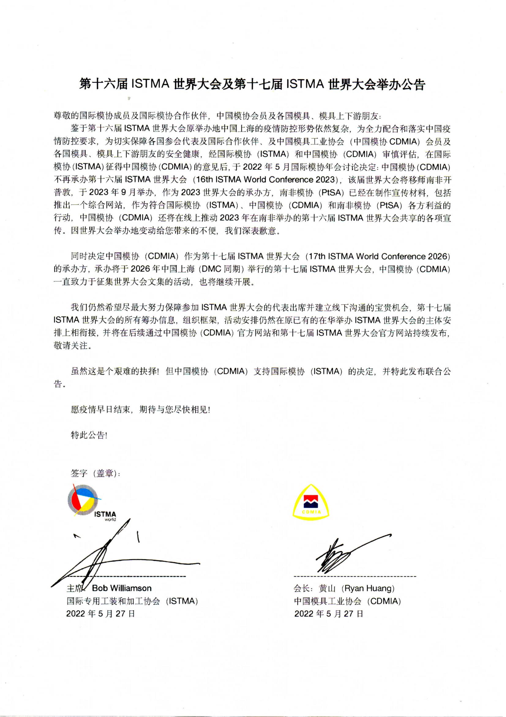 第十六屆ISTMA世界大會(huì)及第十七屆ISTMA世界大會(huì)舉辦公告