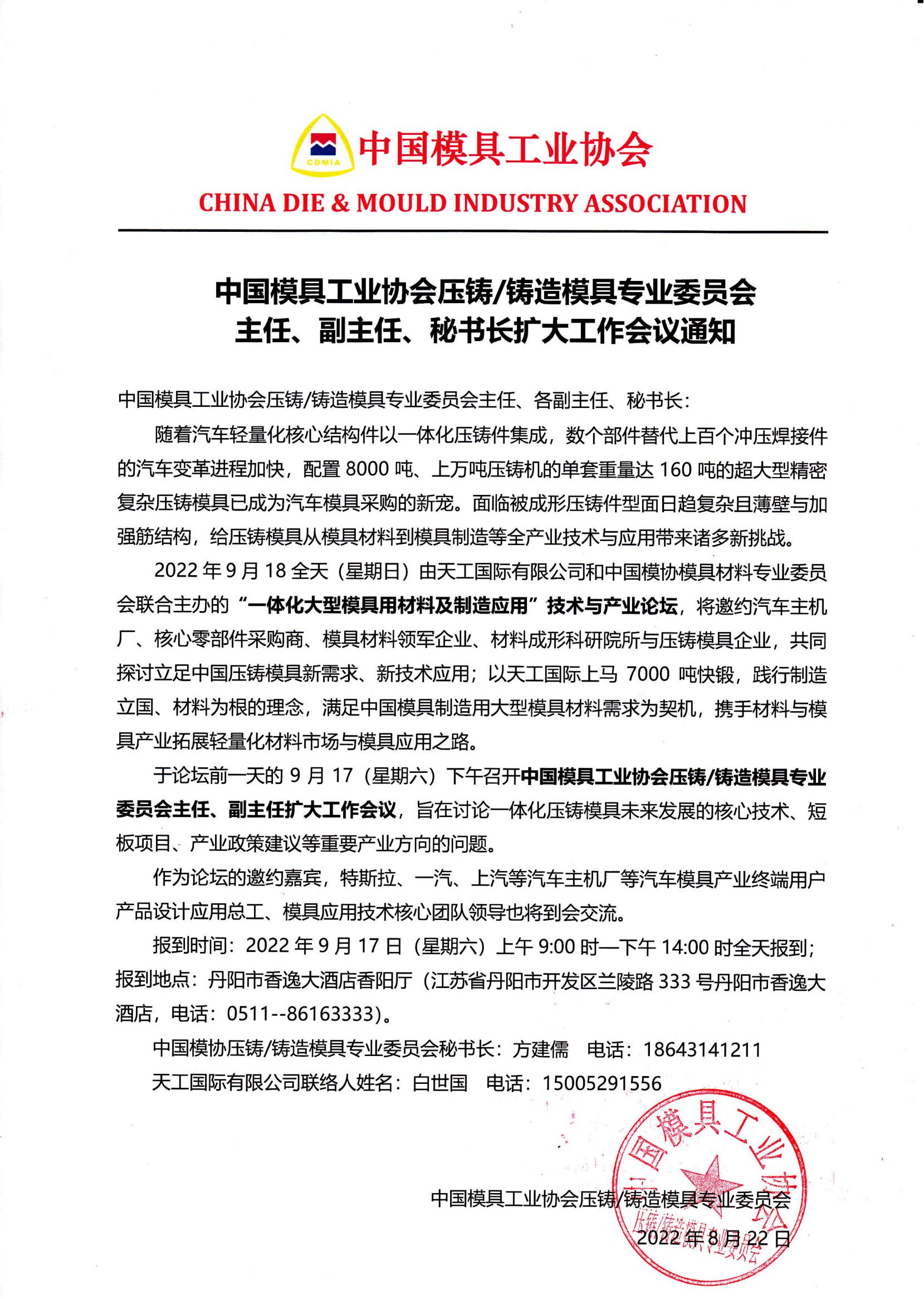 2.中國(guó)模具工業(yè)協(xié)會(huì)壓鑄/鑄造模具專(zhuān)業(yè)委員會(huì)主任、副主任工作會(huì)議時(shí)間:9月17日下午