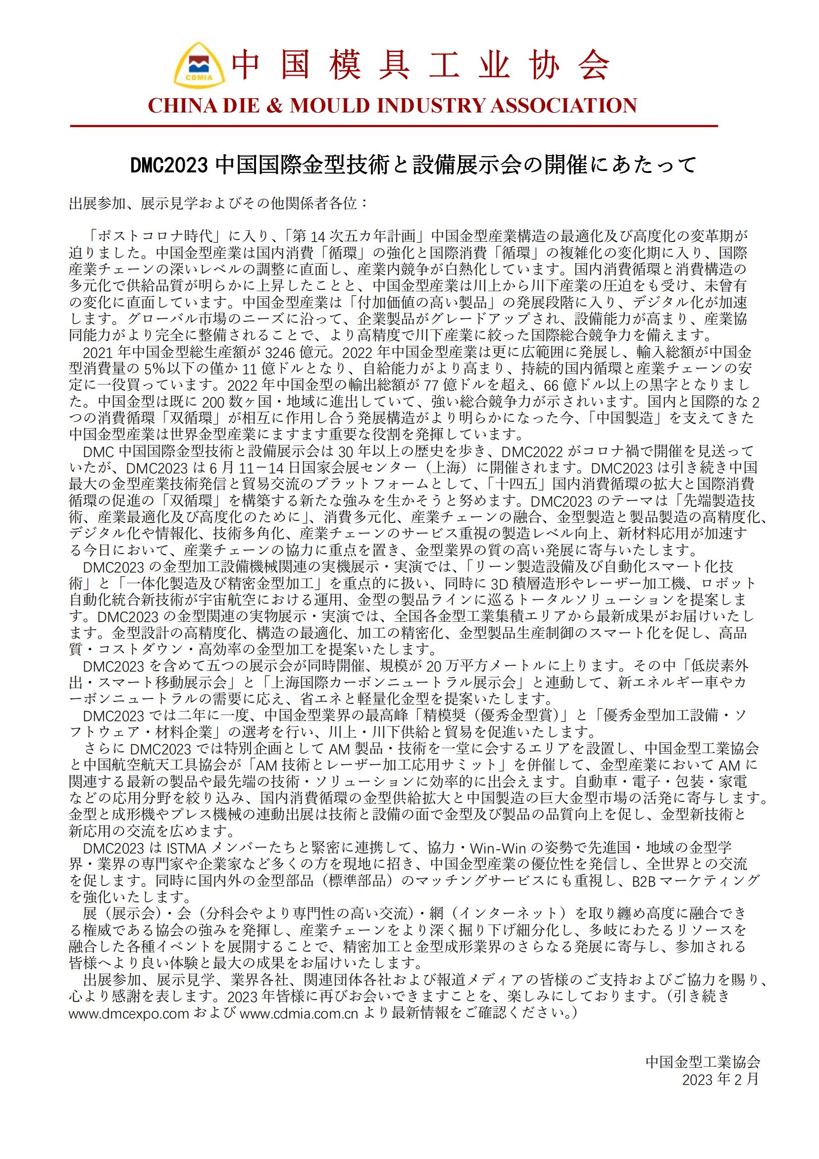 DMC2023 中國(guó)國(guó)際金型技術(shù)と設(shè)備展示會(huì)の開(kāi)催にあたって