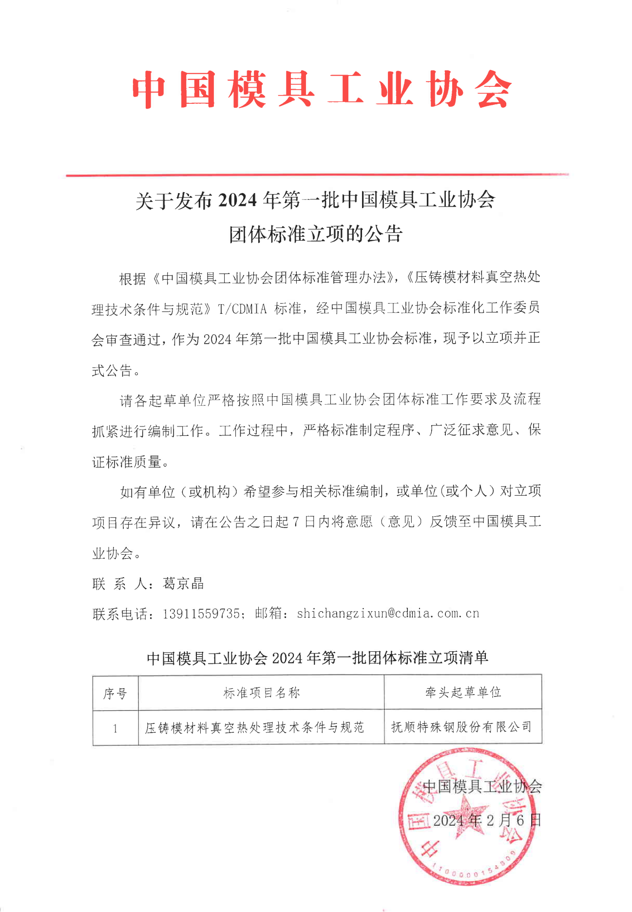 關于發布2024年第一批中國模具工業協會團體標準立項的公告